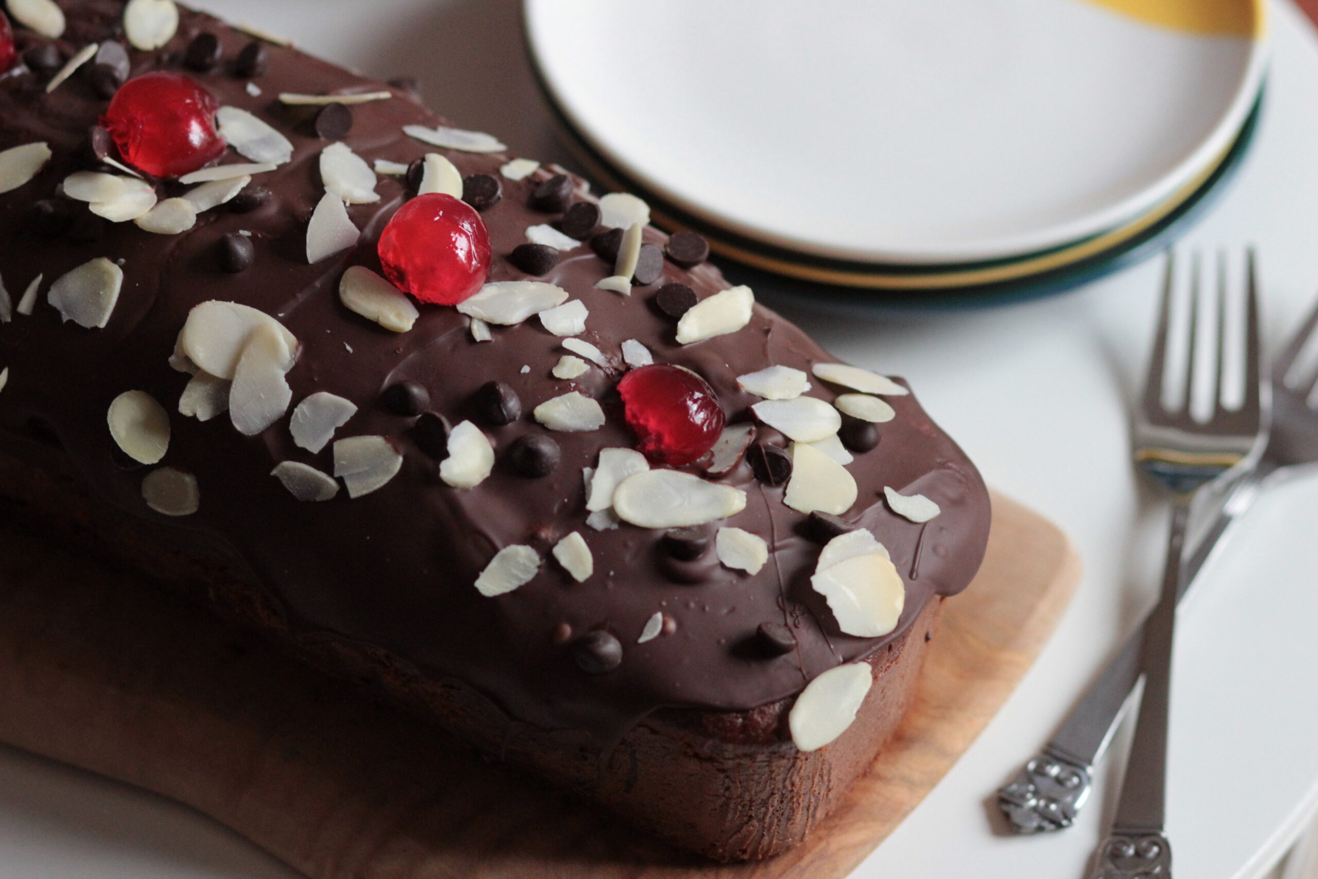Bizcocho húmedo de chocolate, relleno de frutos secos tostados,